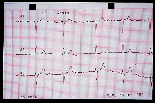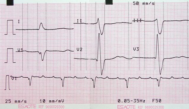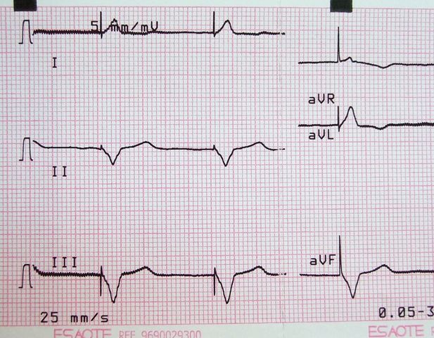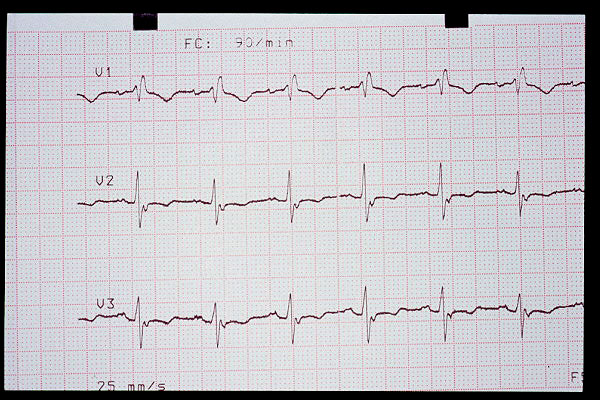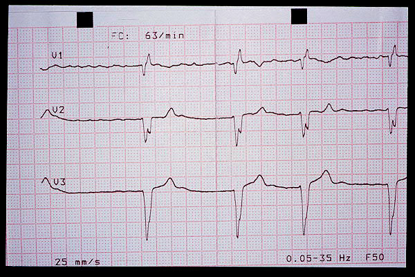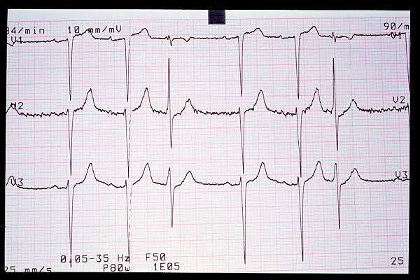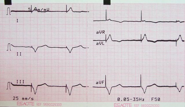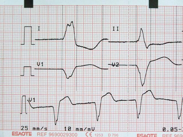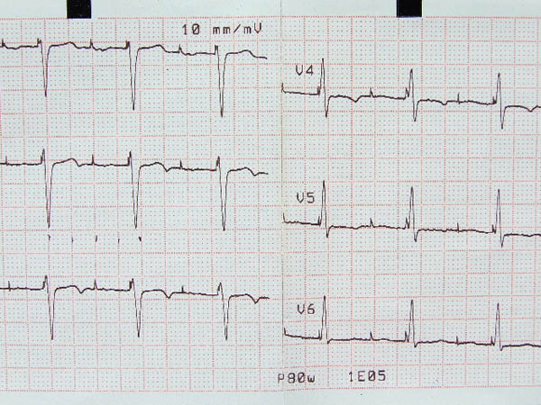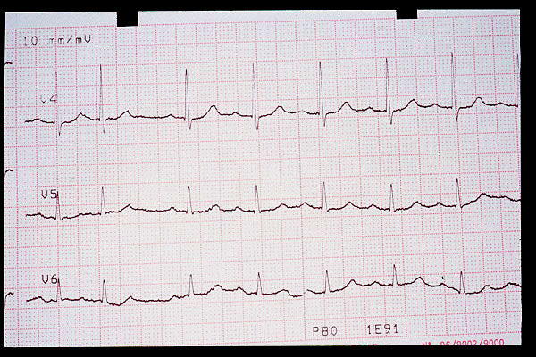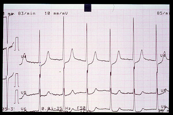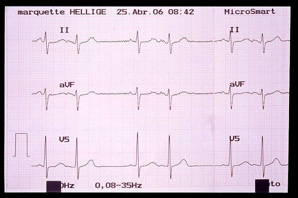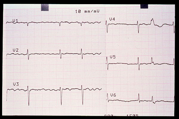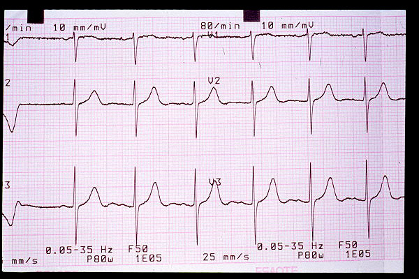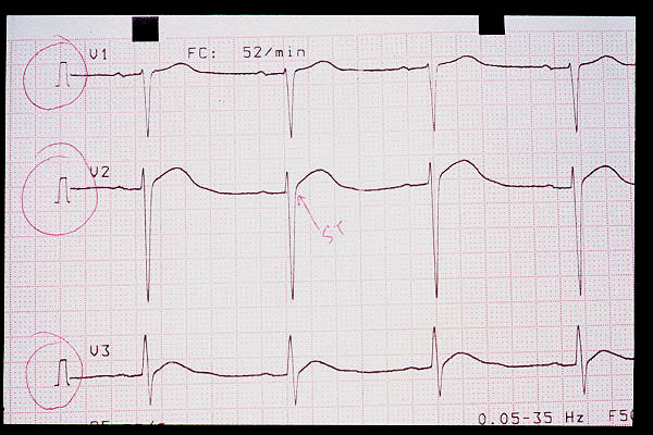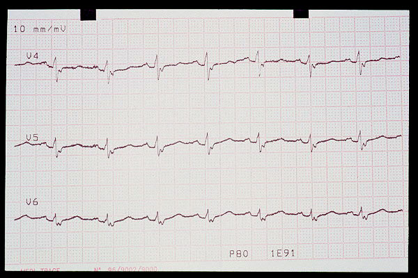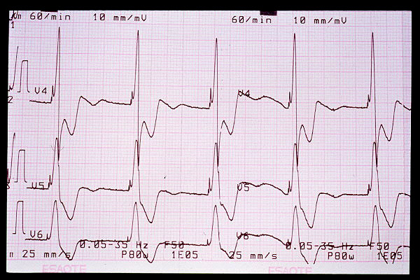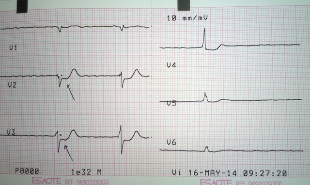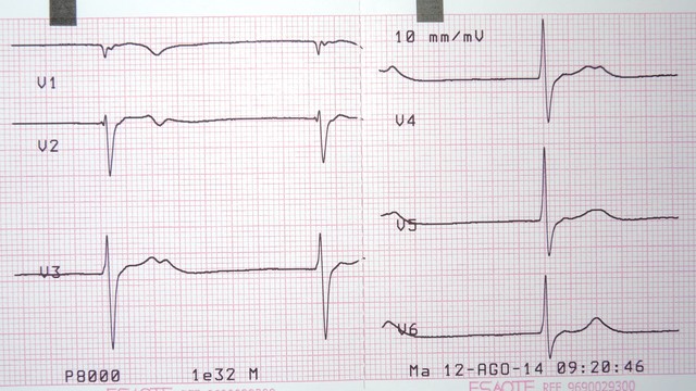 Elevación de ST en V2, bloqueo AV 1º (mV en 5 mm)