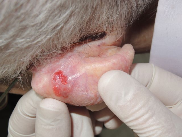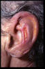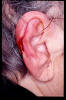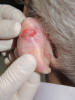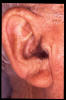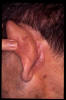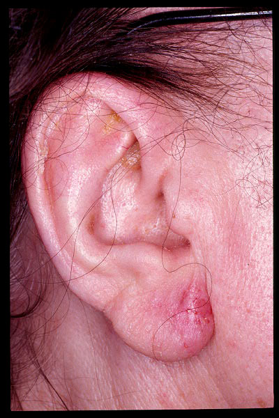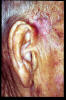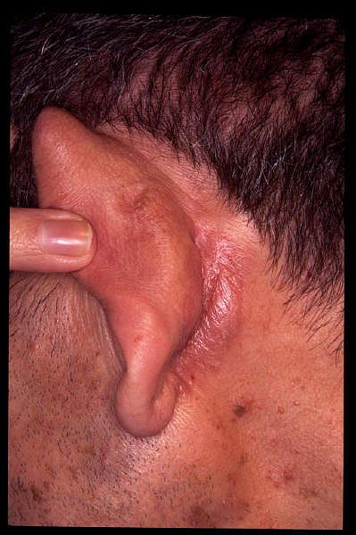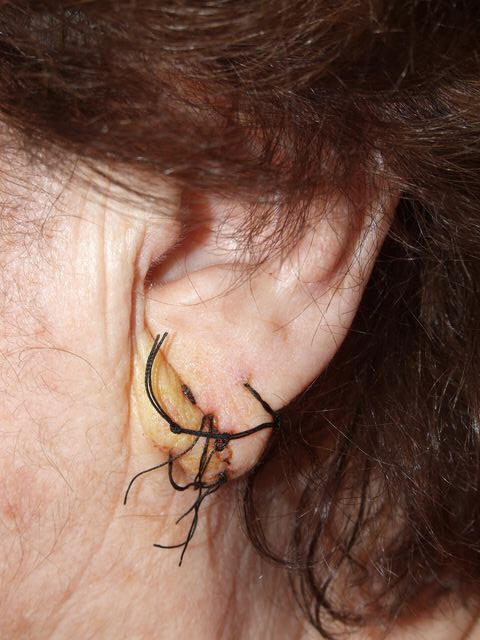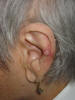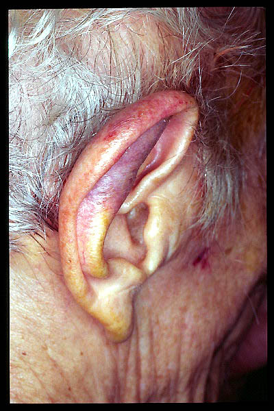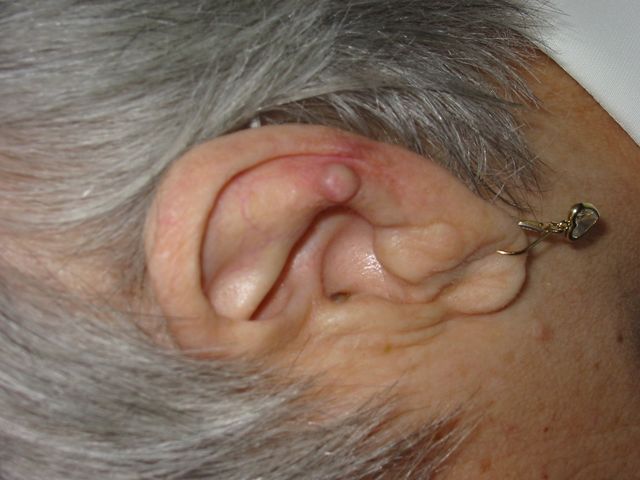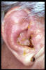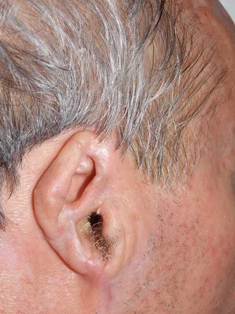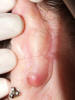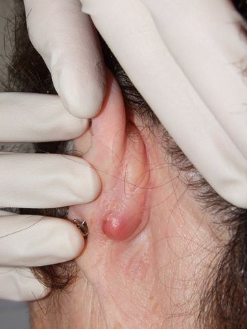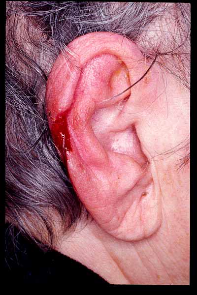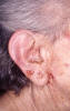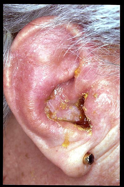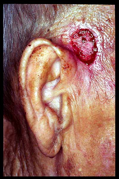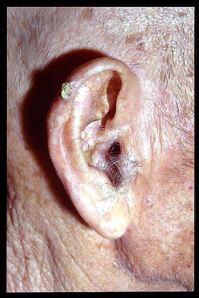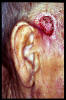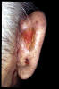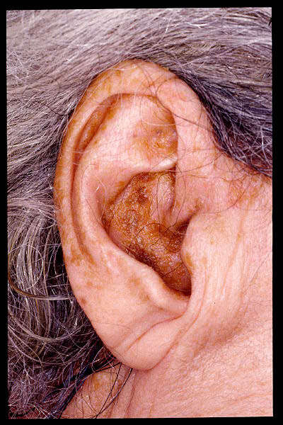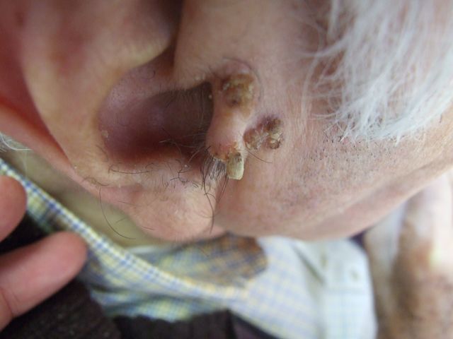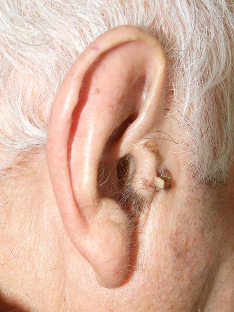 Queratosis retroauricular tras quimioterapia local. Ulceración.
