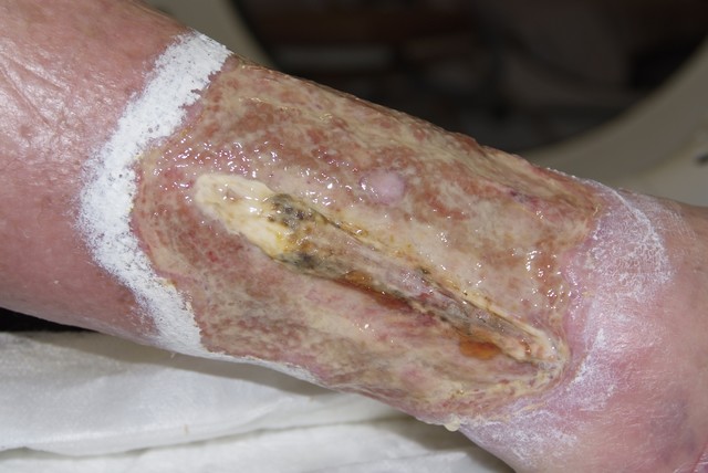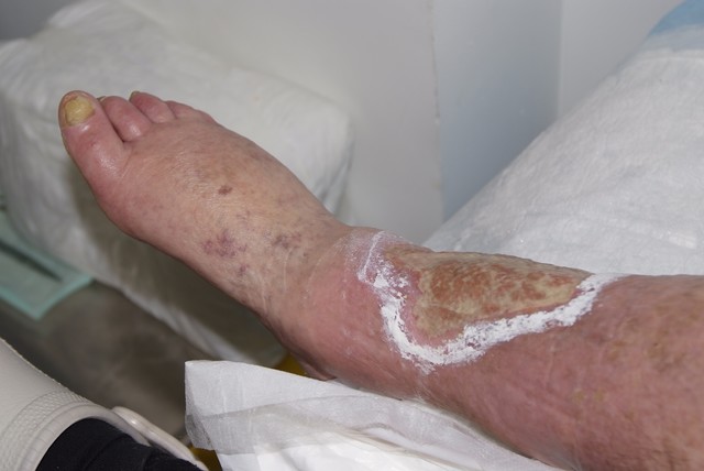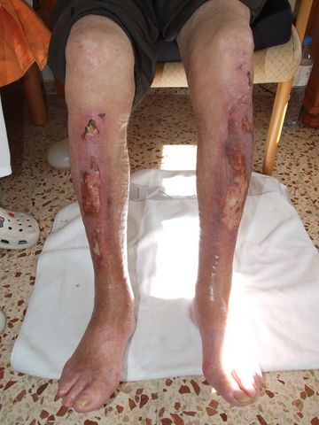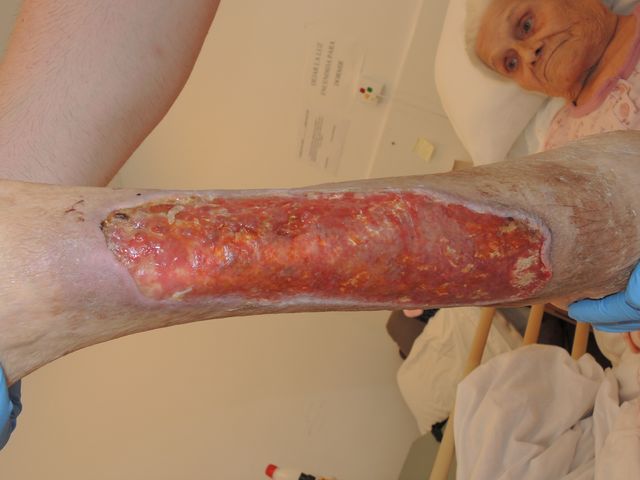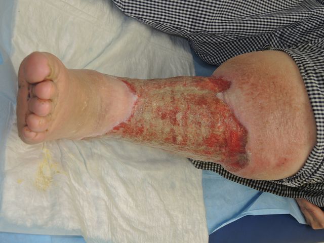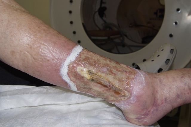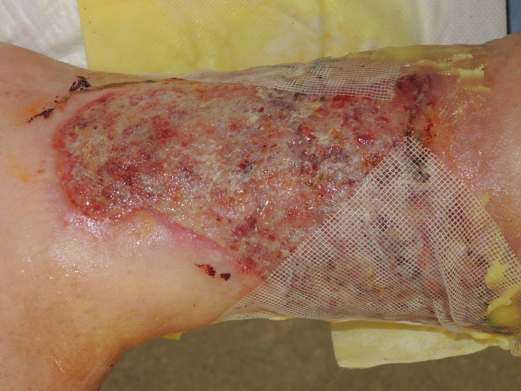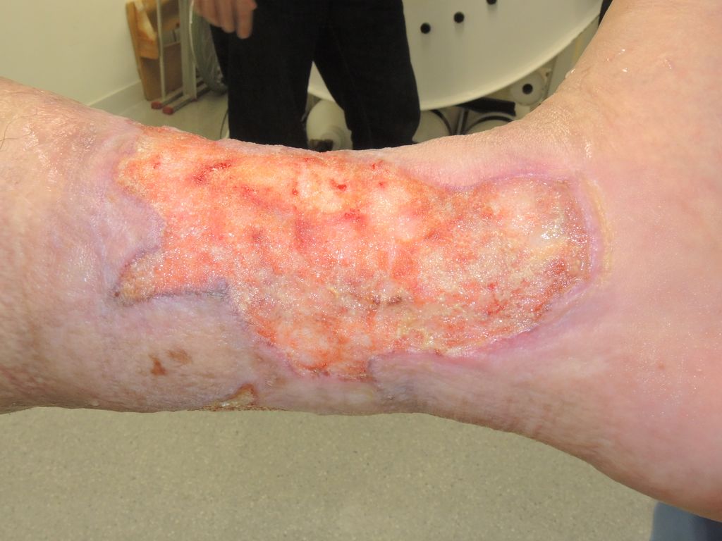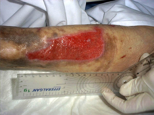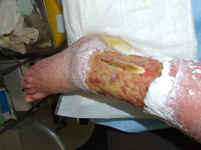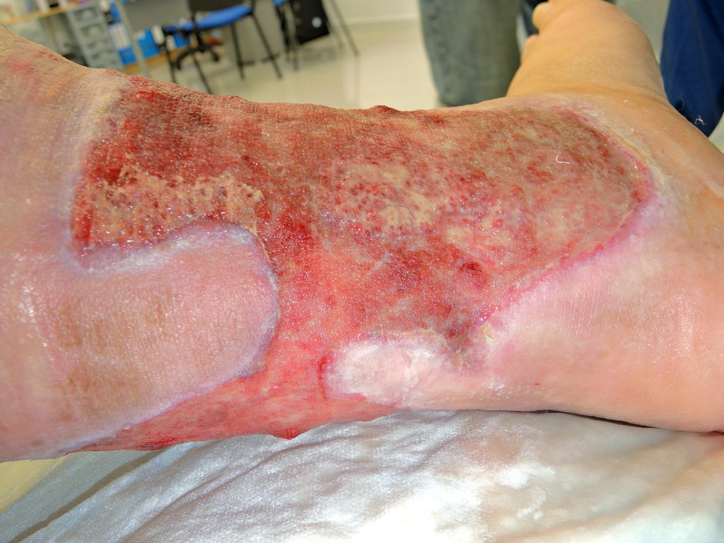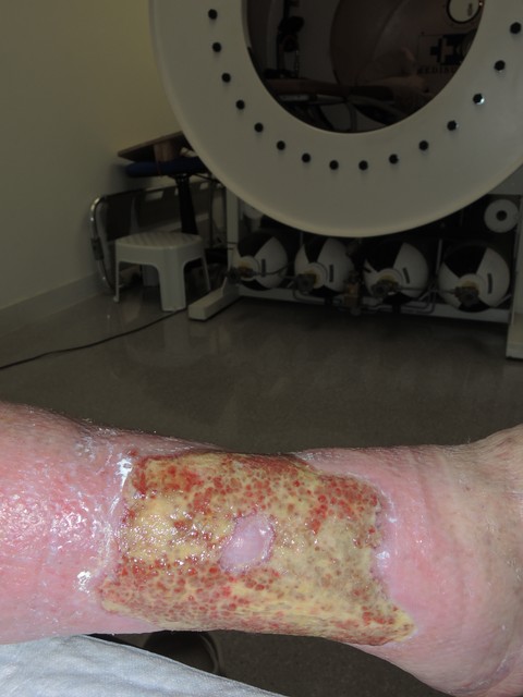 Pérdida cutánea cronificada por quemadura. Afecta a toda la circunferencia de la pierna. En tto con OHB.