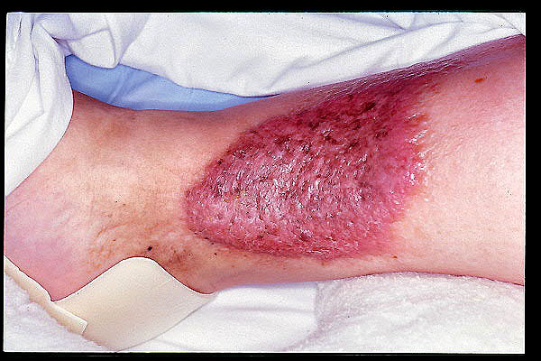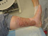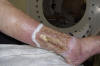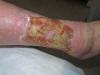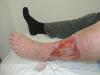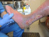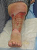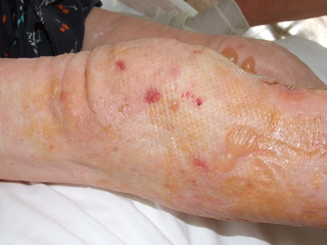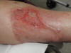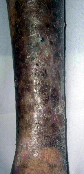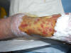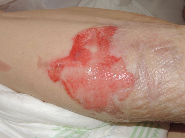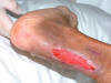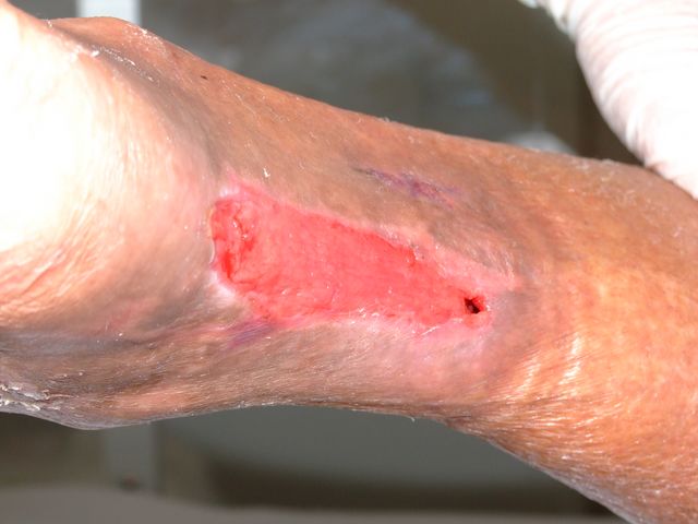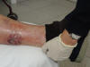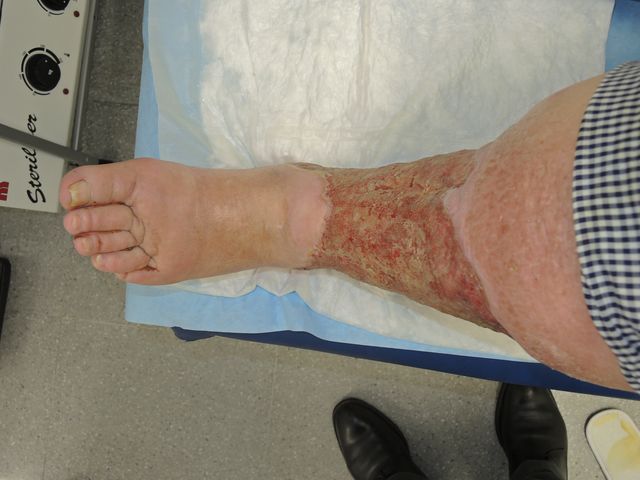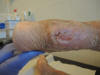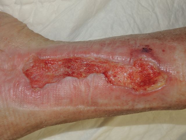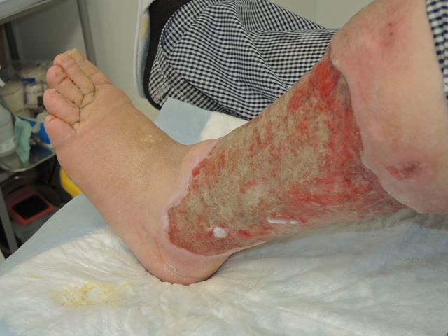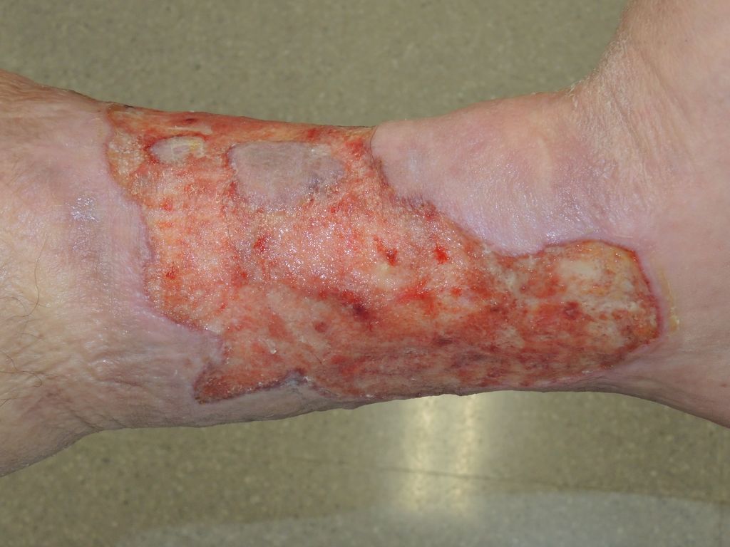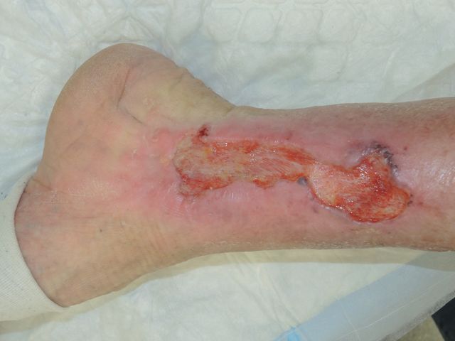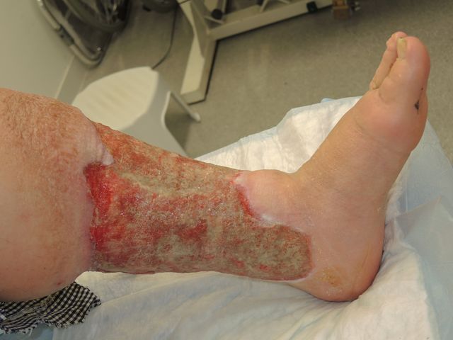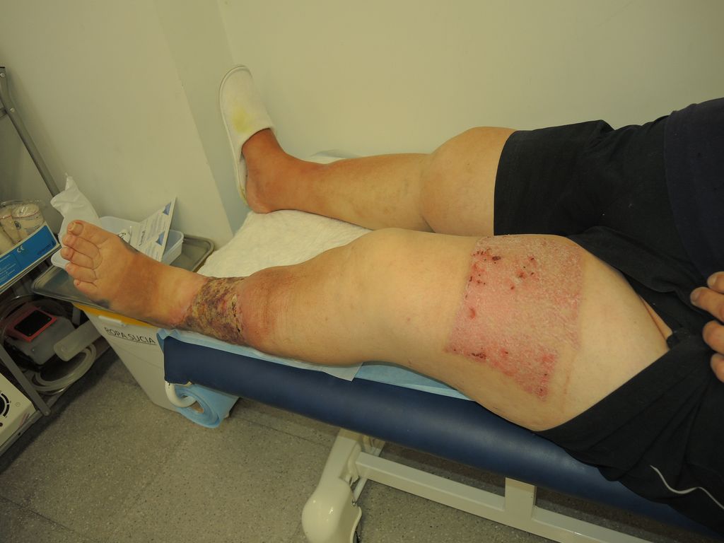 Pérdida cutánea cronificada por quemadura. Afecta a toda la circunferencia de la pierna. En tto con OHB.