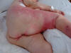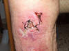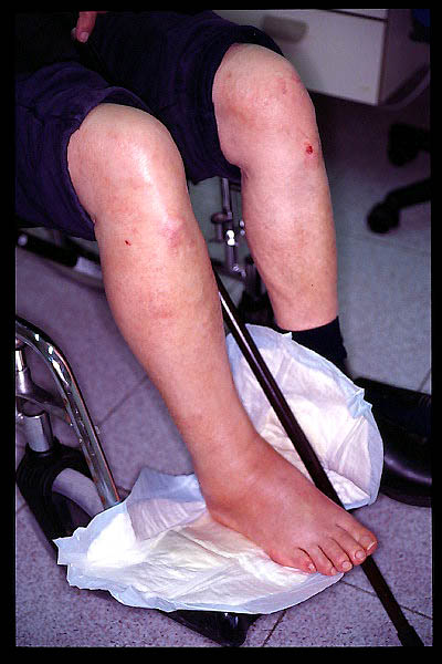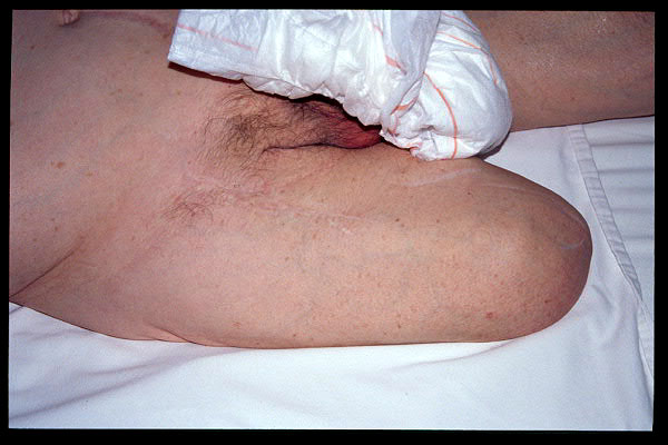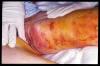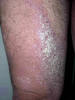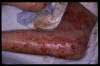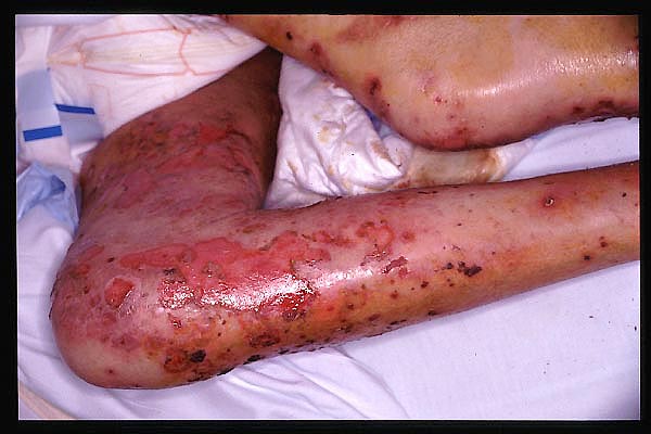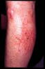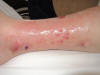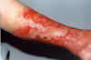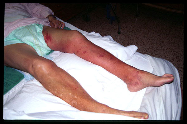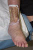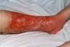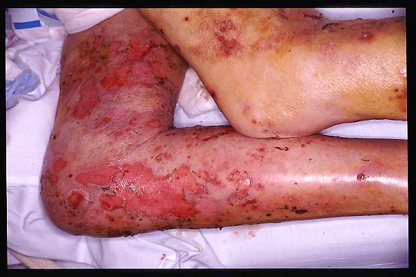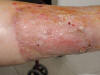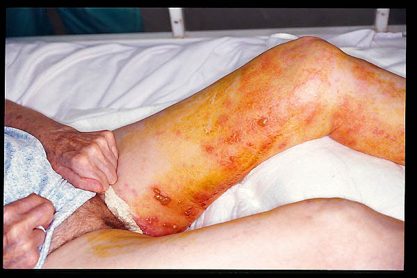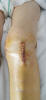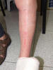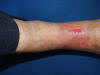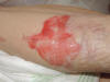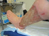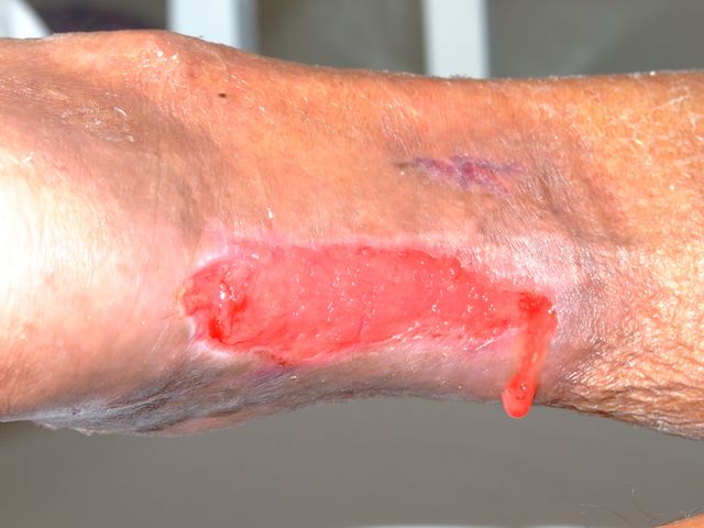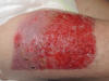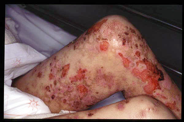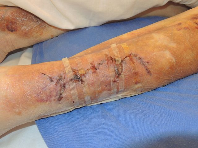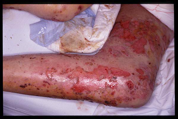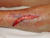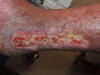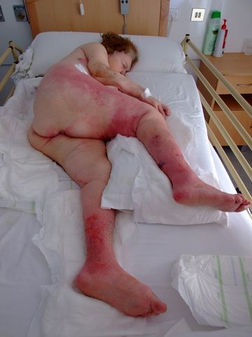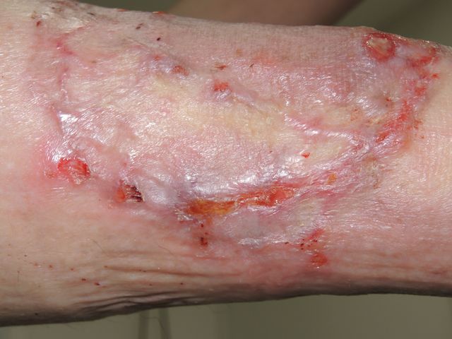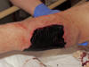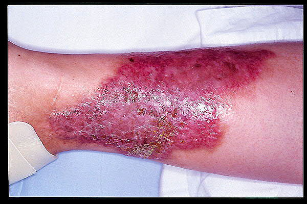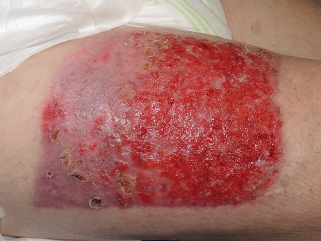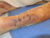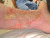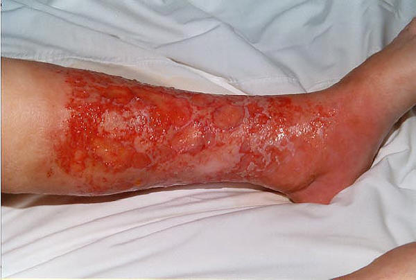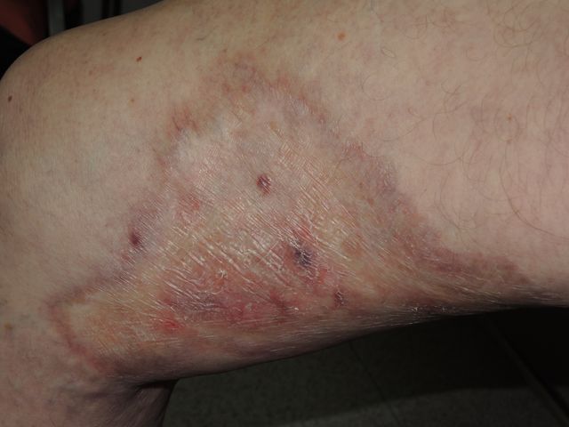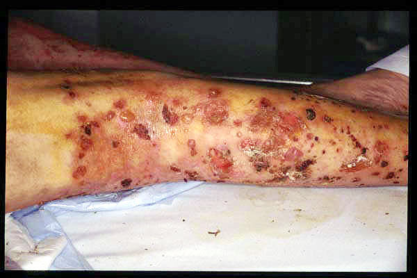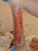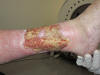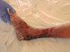Pérdida cutánea cronificada por quemadura. Afecta a toda la circunferencia de la pierna. En tto con OHB.