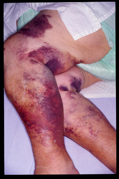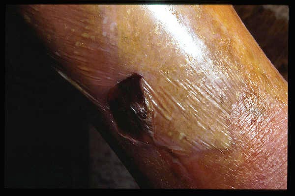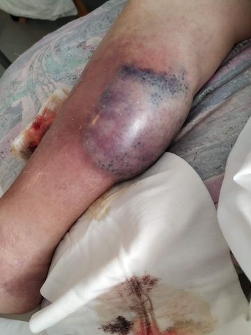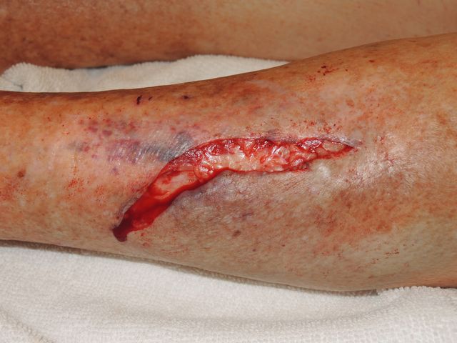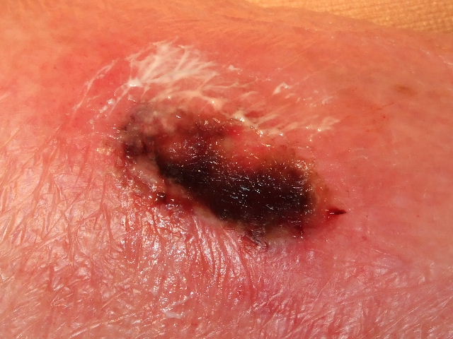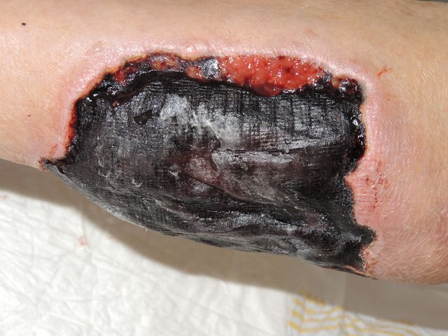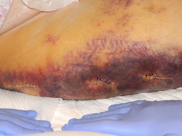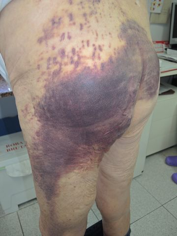 Necrosis cutánea sobre gran hematoma subcutáneo. Trauma sobre ACO. Tras retirada de piel e inicio del tratamiento local. En evolución.