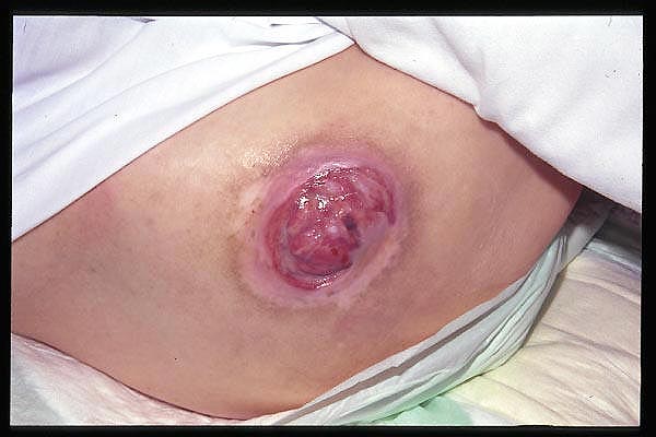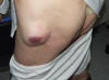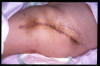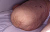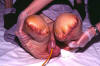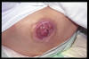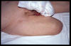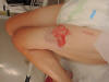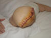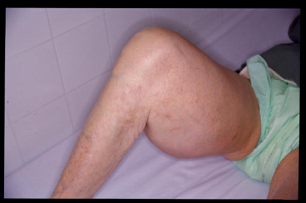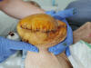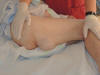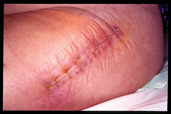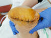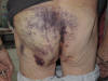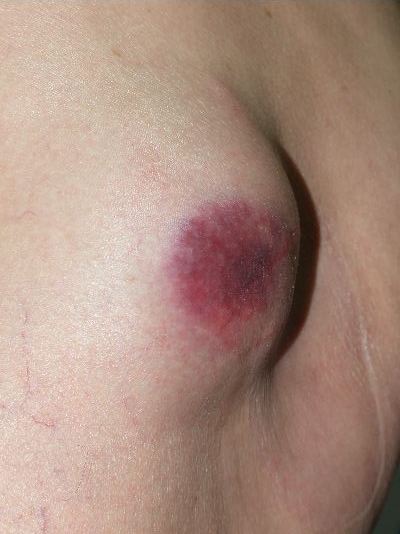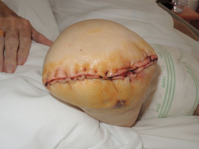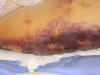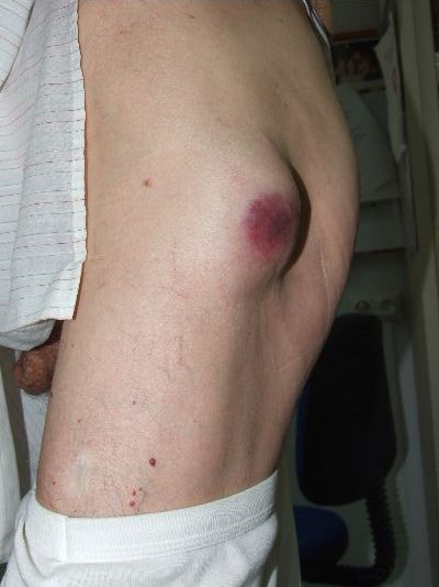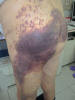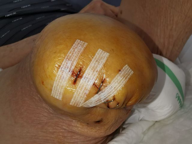 Necrosis cutánea sobre gran hematoma subcutáneo. Trauma sobre ACO. Previo a la extirpación de la zona.