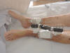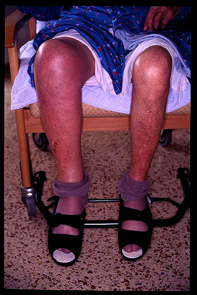 Necrosis de muñón por vendaje apretado. Paciente en situación terminal tras biamputación.